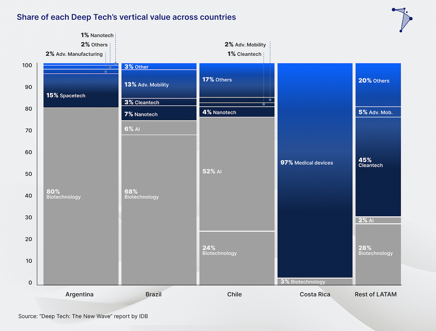 The Deep Tech: The New Wave report by the International Development Bank also includes a breakdown of value created by country, offering a more granular approach to the strengths and opportunities across LATAM.