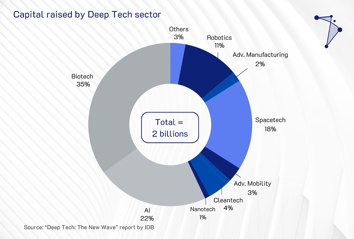 Of the $2 billion USD raised by Deep Tech startups between 2018 and 2023 in LATAM, Space Tech (18%) and Medical Devices (11%) lead the way, together accounting for nearly 30% of the total.