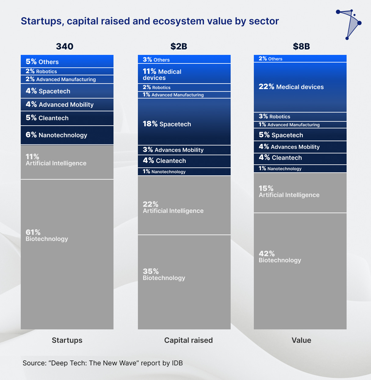 Despite accounting for only about a third of LATAM’s Deep Tech startups, sectors like Spacetech, Medical Devices, Nanotechnology, and Cleantech have demonstrated a significant impact, both in terms of capital raised and value created. These sectors are not only thriving locally but are also making strides in international markets, showcasing the region's capacity for global innovation.